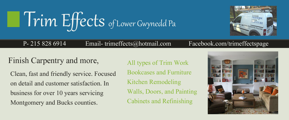 wainscoting crown molding trimwork kitchens cabinets trimeffects bookcases baseboard casings doors doorways refinishing furniture ambler pa lower gwynedd pa carpentry carpenter finish carpentry window seats shelving cubbies wood working coffered ceiling cabinetry